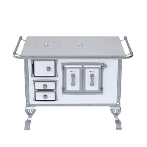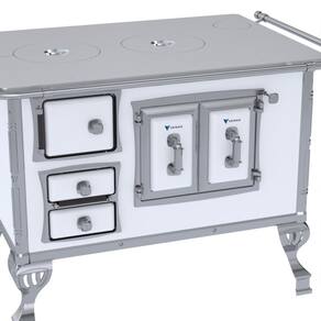 Fogão a lenha N2 Séc.XVIII com chapa de alumínio polida, varão de proteção cromado, corpo em chapa QCV esmaltada, cantoneiras em inox, porta dupla no forno e forno esmaltado.Tipo