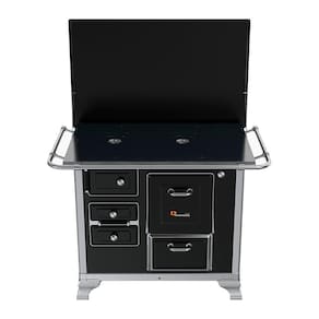 Características: Tipo de fogão: A Lenha Tamanho: Número 1 Chapa: Ferro fundido polida Tampa: Sim Saída da chaminé: Direita Pés: Pintados em alumínio