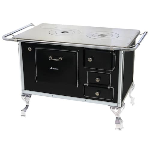 O Fogão a Lenha 02 conta com corpo e forno totalmente em aço carbono com acabamento esmaltado a fogo na pintura Preta. Seus pés são em ferro fundido com pintura em alumínio, contando também com cantoneiras em aço inox e guarnições em ferro fundido cromado garantindo qualidade exclusiva e um ótimo acabamento no seu Fogão a Lenha.