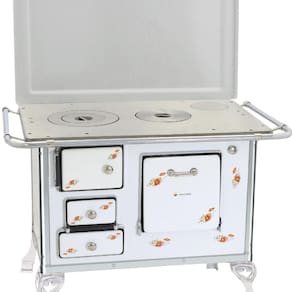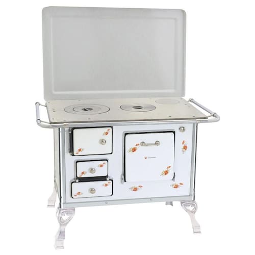 O Fogão a Lenha 01 conta com corpo e forno totalmente em aço carbono com acabamento esmaltado a fogo na pintura Branca. Seus pés são em ferro fundido com pintura em alumínio, contando também com cantoneiras em aço inox e guarnições em ferro fundido cromado garantindo qualidade exclusiva e um ótimo acabamento no seu Fogão a Lenha com estampa florida.