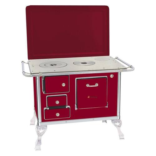O Fogão a Lenha 01 conta com corpo e forno totalmente em aço carbono com acabamento esmaltado a fogo na pintura Vermelha. Seus pés são em ferro fundido com pintura em alumínio, contando também com cantoneiras em aço inox e guarnições em ferro fundido cromado garantindo qualidade exclusiva e um ótimo acabamento no seu Fogão a Lenha.