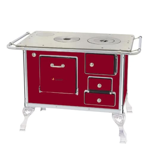 O Fogão a Lenha 01 conta com corpo e forno totalmente em aço carbono com acabamento esmaltado a fogo na pintura Vermelho Intenso. Seus pés são em ferro fundido com pintura em alumínio, contando também com cantoneiras em aço inox e guarnições em ferro fundido cromado garantindo qualidade exclusiva e um ótimo acabamento no seu Fogão a Lenha.