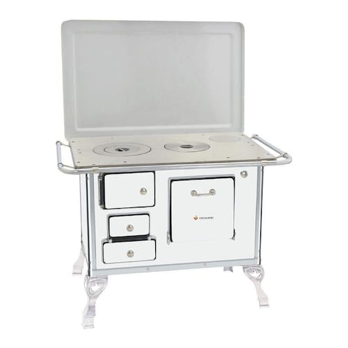 O Fogão a Lenha 02 conta com corpo e forno totalmente em aço carbono com acabamento esmaltado a fogo na pintura Branca. Seus pés são em ferro fundido com pintura em alumínio, contando também com cantoneiras em aço inox e guarnições em ferro fundido cromado garantindo qualidade exclusiva e um ótimo acabamento no seu Fogão a Lenha.