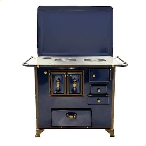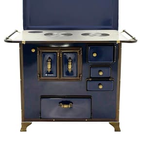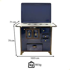 Fogão a lenha com chapa em ferro fundido super polido, corpo e forno em aço carbono esmaltado. Pés em ferro fundido modelo rústico com acabamento em ouro envelhecido. Puxador e escoras do varão em Zamak com acabamento em ouro envelhecido. Varões em tubo de aço com acabamento em ouro envelhecido. Guarnições em ferro fundido com acabamento em ouro envelhecido. Forno com sistema de abertura de porta dupla. Possui compartimento inferior para armazenagem da lenha, mantendo-a seca. Modelo acompanha tampa.Tipo