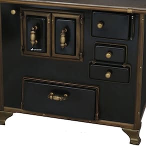 Chapa em ferro fundido com super polimento e maior dimensão, Pés em ferro fundido modelo rústico com acabamento em ouro envelhecido, Corpo e forno do fogão totalmente em aço carbono com acabamento esmaltado, Puxador e escoras do varão em Zamak com acabamento em ouro envelhecido, Varões em tubo de aço com acabamento em ouro envelhecido, Guarnições em ferro fundido com acabamento em ouro envelhecido, Modelo acompanha tampa, Forno com sistema de abertura de porta dupla, Modelo com conceito de antiguidade, Possui compartimento inferior para armazenagem da lenha, mantendo-a seca.Tipo
