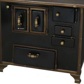 Chapa em ferro fundido com super polimento e maior dimensão; Pés em ferro fundido modelo rústico com acabamento em ouro envelhecido; Corpo e forno do fogão totalmente em aço carbono com acabamento esmaltado; Puxador e escoras do varão em Zamak com acabamento em ouro envelhecido; Varões em tubo de aço com acabamento em ouro envelhecido; Guarnições em ferro fundido com acabamento em ouro envelhecido; Modelo acompanha tampa; Forno com sistema de abertura de porta dupla; Modelo com conceito de antiguidade; Possui compartimento inferior para armazenagem da lenha, mantendo-a seca.Tipo