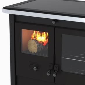 DESCRIÇÃO DO FOGÃO A LENHA LE CORBUSIER - Tipo: Fogão a lenha - Chapa: Vidro Vitrocerâmico com moldura Pintada - Dupla Combustão: Sim - Varão de proteção: Frontal de alumínio escovado - Suporte do varão de proteção: Aço 3mm pintado em preto - Fornalha: Tijolos refratários pré-moldados - Porta da fornalha: Vidro Vitrocerâmico - Tranca da porta da fornalha: Sim - Porta do ar: Esmaltada - Gaveta de cinzas: esmaltada - Forno: Sim - Porta do forno: Vidro Vitrocerâmico - Prateleiras do forno: 2 removíveis - Guarnições das portas: Chapa de aço - Puxadores: Baquelite na cor preta - Pés: 4 pés reguláveis - Acessórios: Pé e gancho para manuseio - Saída da chaminé: Central traseira - Revestimento corpo do produto: Pintura eletrostática - Termômetro no forno: Sim - Tipo de Montagem: Piso - Capacidade do Forno: 40 L - Caldeira: Não - Gabinete: Sim - Saída do Chaminé: Central Traseira - Chapa n 2 - Cor: Preto