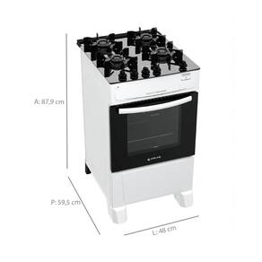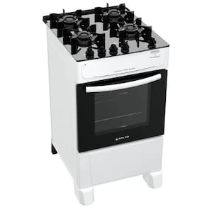 Características: Fogão Atlas 4 bocas Acendimento automático 4 queimadores ramal, sendo dois de 2,0kW e dois de 1,7kW Mesa de vidro Trempes: chapa de aço esmaltado Manípulos removíveis Vidro duplo na porta do forno Visor amplo na porta do forno Acabamento forno: limpa fácil Grades: 1 deslizante Capacidade do forno: 50 L Temperatura forno: 190° a 290°