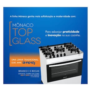 Tão eficiente quanto a linha Mônaco, o produto agora vem com o diferencial da mesa de vidro, trazendo um toque de sofisticação e mais praticidade na hora da limpeza. Além disso o modelo possui forno com uma grade deslizante, puxador em aço e acabamento Limpa Fácil.
