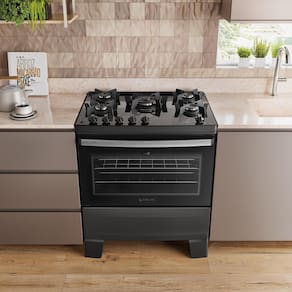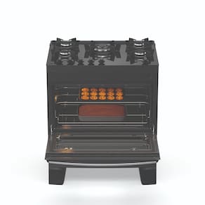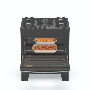 Para quem busca agilidade máxima, o queimador central Tripla Chama de 3,3 kW oferece a potência necessária para o preparo rápido de receitas volumosas. O conforto no uso é garantido pelas duas prateleiras no forno, sendo uma delas autodeslizante, que traz o alimento até você com total segurança. Com o visor amplo e a luz interna, você monitora seus assados sem precisar abrir a porta, preservando o calor e garantindo o ponto perfeito.