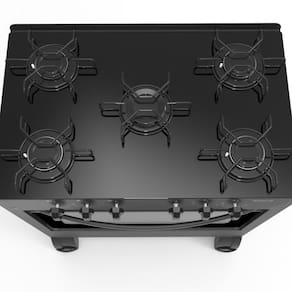 Este modelo possui 1 queimador tripla chama de 3000W e 4 queimadores de 2000W, além de suporte de trempe esmaltado que não risca, pés altos de 130 mm, manípulos anatômicos e forno com sistema Easy Clean, tornando o uso diário mais funcional e seguro. Seu acabamento preto agrega sofisticação à sua cozinha.