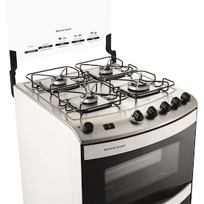 Seu design é compacto e com acabamento impecável Brastemp. Fácil de manusear e com a moderna mesa flat top plana com grades individuais de ferro fundido, mais moderna e fácil de limpar. Possui um dos queimadores de alto desempenho para acelerar o tempo de cozimento e trempes individuais que garantem todo o charme e elegância do fogão. Seu forno possui iluminação interna, grade deslizante e um moderno revestimento que impede o acumulo de gordura em suas paredes.