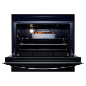 Ao abrir a porta do forno uma das prateleiras desliza automaticamente, facilitando a retirada dos alimentos.