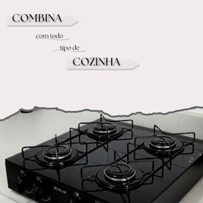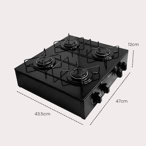 Principais Diferenciais 🔥 4 bocas para mais agilidade no preparo 💨 Funcionamento com gás GLP (botijão tradicional) ?? Não possui acendimento elétrico (acendimento manual) 🪶 Portátil e leve: ideal para qualquer ambiente 🧼 Fácil instalação: não precisa embutir 🛡? Trempes individuais: mais estabilidade para as panelas 🪟 Tampo de vidro: moderno, resistente e fácil de limpar 🎨 Disponível em preto ou branco 🔠 Detalhes como escritas, botões e grades podem variar conforme o lote, mas sem alterar funcionalidade