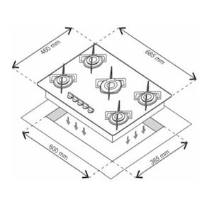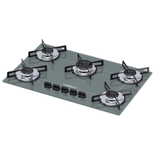 Cooktop Chamalux 5 bocas com ultra chama, mesa de vidro temperado, trempes e grades esmaltadas com sistema de encaixe, acendimento inteligente e funcionamento bivolt.Luz de calor residual