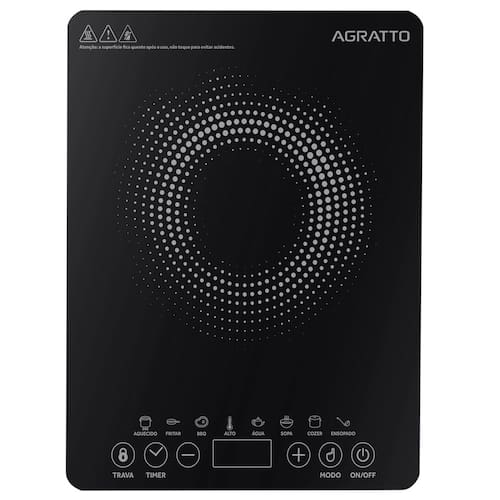 Fogão Cooktop de Indução Uma Boca 220V Elétrico Toch Screen Display Digital Timer Agratto Acki01i-02. Aquece por meio de um campo eletromagnético criado entre a bobina indutora interna e o fundo da panela. A zona de indução somente aquece enquanto a panela estiver em contato com a superfície, mantendo todo calor concentrado nela de forma uniforme. Funciona com panelas com fundo fundido ou 100% aço inox com múltiplas camadas, procure pelo símbolo de indução no fundo da sua panela. Para confirmar, teste o fundo da panela com um imã, se grudar, é compatível.Luz de calor residual