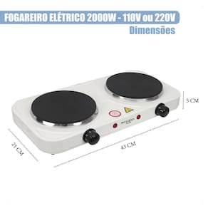 Fogão elétrico portátil com 2 bocas, potência total de 2000W, design moderno em inox, fácil limpeza e controle independente de temperatura.Luz de calor residual