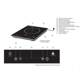 Cooktop Fischer de 1 boca por indução com mesa vitrocerâmica, controle Touch Screen, 10 níveis de potência, timer de até 4 horas e trava de segurança. Compatível com panelas de fundo ferroso.Luz de calor residual