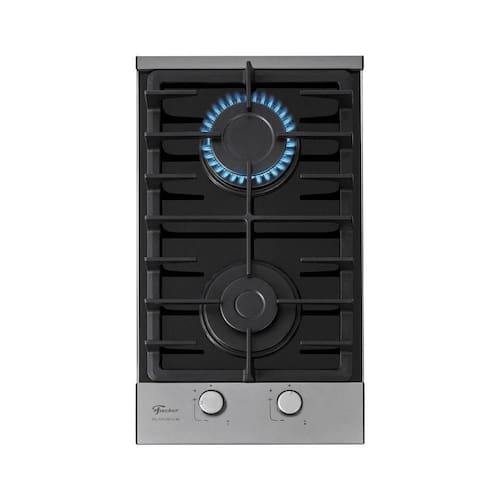 Cooktop Fischer 2 queimadores com acendimento superautomático, mesa de vidro preto e trempes duplas em ferro fundido esmaltado.Alimentação