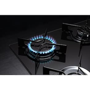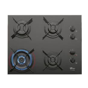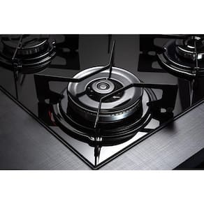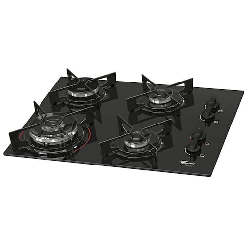 Cooktop Fischer Fit Line com 4 queimadores, incluindo um tripla chama, mesa de vidro temperado preta, trempes esmaltadas individuais, acendimento superautomático e tecnologia italiana de alta eficiência.Luz de calor residual