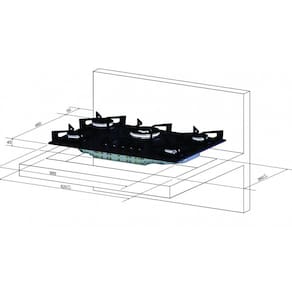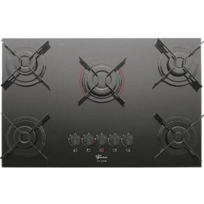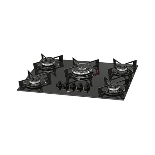 Cooktop Fischer Fit Line com 5 queimadores, incluindo um tripla chama. Mesa de vidro temperado preta, trempes esmaltadas, acendimento superautomático e queimadores italianos SABAF de alta eficiência.Luz de calor residual