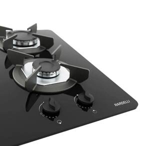 Cooktop Nardelli SAFE2 com 2 bocas, tecnologia de interrupção de gás, acendimento superautomático, trempes em ferro fundido, vidro temperado e flanges em inox. Ideal para cozinhas menores e otimização de espaço.Luz de calor residual