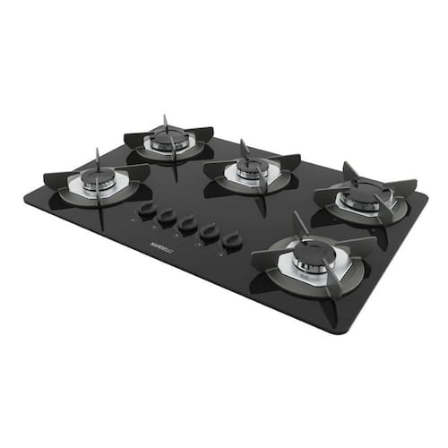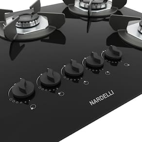 Fogão Cooktop Nardelli SAFE5 com 5 bocas, mesa de vidro temperado, acendimento superautomático, válvula de segurança, trempes em ferro fundido e acabamento em inox.Alimentação
