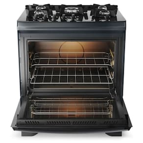 Seu puxador em alumínio escovado une elegância, conforto e segurança no uso diário. A versão 5 bocas conta com tripla chama, perfeita para agilizar o preparo das refeições. Já as grades individuais de ferro fundido com 6 pontos de apoio garantem estabilidade e aderência para qualquer tipo de panela.