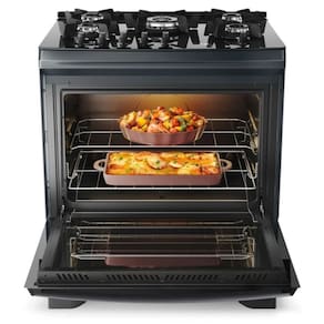 O forno limpa fácil e o isolamento térmico tornam a limpeza simples e o uso mais eficiente, assando os alimentos de forma uniforme. Com duas prateleiras deslizantes ajustáveis, você ganha flexibilidade para preparar desde pratos pequenos até grandes assados.
