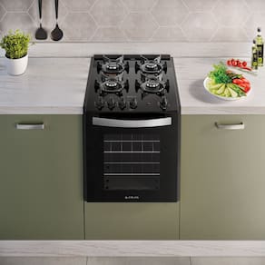 Ja a mesa de vidro temperado da um toque moderno e elegante a sua cozinha, e o puxador em aluminio escovado traz sofisticacao e conforto no uso diario. Para combinar, o fogao conta com acendimento automatico, que facilita o uso no dia a dia, trazendo mais conforto e praticidade desde o primeiro toque.