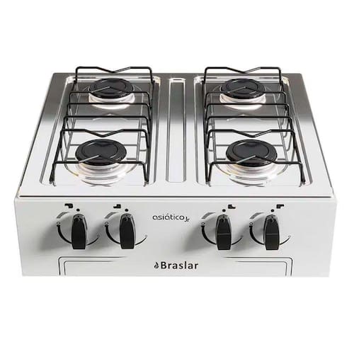 Características: Fogão Marca: Braslar Modelo: Asiático Júnior Origem: Nacional Quantidade de bocas: 4 Bocas Acendimento: Manual Material da mesa: Aço inox Funcionamento: GLP - A conversão para GN precisa ser adaptada, conforme consta no manual do produto Potência dos queimadores: Família: 7,5 kW Eficiência energética: A Manípulos removíveis: Sim Tampa de vidro: Não Timer: Não Relógio: Não Termostato: Não