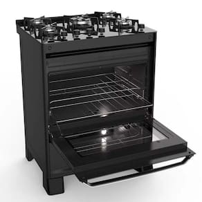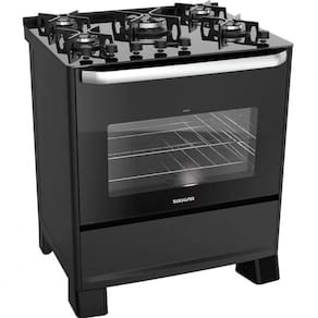 Características técnicas : Design super moderno Botões top control Mesa de vidro temperado: qualidade e alta resistência Trempes individuais de ferro fundido com 6 pontos de apoio: mais modernas, robustas e duráveis Queimador tripla chama central Acendimento automático na mesa e no forno Queimadores injetados Capacidade do forno: 90L Forno Fácil Limpeza: a gordura não gruda e fica mais fácil de limpar Forno com válvula de segurança Dobradiças italianas: amortecem o fechamento da porta Proteção térmica com vidro duplo no forno Controle de temperatura do forno: 180°C a 280°C 1 grade fixa e 1 grade deslizante com 3 níveis de ajuste no forno Puxador em alumínio escovado Pés elevados que facilitam a limpeza do piso Luz no forno -a lâmpada não acompanha o produto-