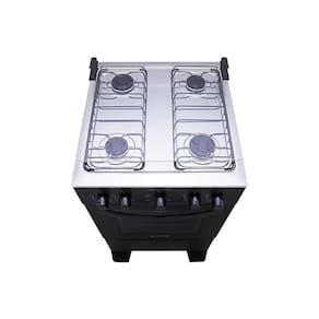 O fogão conta com puxador tubular metálico, que permite mais estabilidade para a abertura da porta do forno, painel moderno que permite controlar melhor a temperatura das bocas e do forno, pés altos e robustos, trempes duplas em aço esmaltado e acendimento manual.
