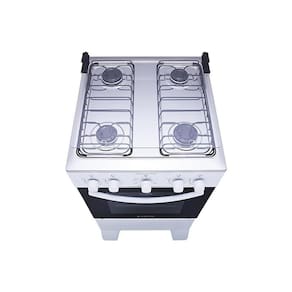O fogão conta com puxador tubular metálico, que permite mais estabilidade para a abertura da porta do forno, painel moderno que permite controlar melhor a temperatura das bocas e do forno, pés altos e robustos, trempes duplas em aço esmaltado e acendimento manual.
