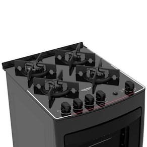 Possui mesa de vidro temperado que facilita a limpeza sem perder o brilho, queimadores potentes e econômicos selados com tecnologia italiana e Trempes de ferro fundido que garantem segurança e durabilidade.