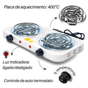 Características do produto: 1.Potência: 2000w 2.Tensão: 220v 60hz 3.Placa única; 4.Tamanho da placa de aquecimento: diâmetro - 140 + 140mm 5.Luz indicadora de funcionamento: ligado/desligado; 6.Controle de auto-termostato - 5 temperaturas; 7.Operação de calor; 8.Espessura: 0,35mm; 9.Atenção: apenas para uso interno; 10.Cor: branco; 11.Tamanho do produto: 43x23,5x7cm ; 12.Plug do brasil; 13. Sem polifoam