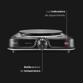 Fogão elétrico cooktop de 1 boca com 1000W de potência, 5 níveis de ajuste de temperatura, indicação luminosa de aquecimento e proteção contra superaquecimento. Possui chapa de ferro fundido e design compacto.Luz de calor residual