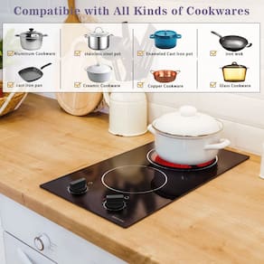 - ?Placa elétrica conveniente?A placa de fogão de queimador duplo é muito conveniente porque a placa elétrica de cerâmica é compatível com qualquer utensílio de cozinha de fundo plano. Com um vidro preto, o fogão elétrico com design suspenso parece muito moderno e moderno. O vidro preto de alta qualidade é fácil de limpar, basta limpá-lo com um pano úmido. (a embalagem contém ferramentas de limpeza)