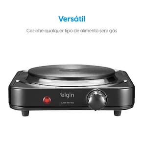 Fogão elétrico portátil com 1 boca, potência de 1000W, controle de temperatura ajustável, base antiderrapante e fácil de limpar. Compatível com diversos tipos de panelas.Lâmpada piloto