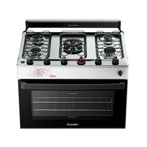 Mesa de aço inox, com tampão de vidro e acendimento automático.