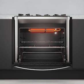 O forno, com capacidade para 110L, é um dos maiores da categoria e conta com uma porta de vidro duplo que impede a fuga de calor, proporcionando economia de energia e maior segurança durante o uso. O Grill Elétrico é perfeito para receitas com melhor aspecto, dourando e gratinando os alimentos e deixando-os ainda mais saborosos. Além disso, o fogão possui uma lâmpada interna que facilita a visualização dos assados, controle de temperatura do forno, porta com abertura ergonômica e acendimento automático total, seguro e sem riscos de queimadura.