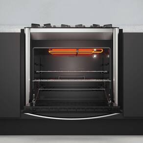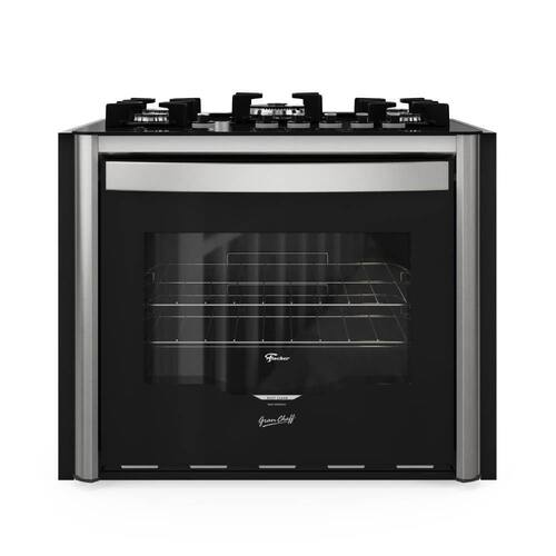 - Acabamento: Mesa de vidro temperado na cor preta; Suporte da trempe esmaltado em easy clean preto; Trempe individual; Manipuladores (botões) na cor preto removíveis; Fogão com 5 queimadores: 1 queimador tripla chama ( 3750W) 1 queimador rápido (2850W), 3 queimadores semirrápidos (1950W); Forno com 1 queimador (3500W); Potência elétrica grill/dourador: 1000W; Puxador em alumínio escovado anodizado; Laterais em aço pintado silver; Porta com vidro duplo serigrafado e amplo visor; Perfil frontal em aço pintado silver; Resistência interna do forno blindada; 2 Grades cromadas, ajustáveis, deslizantes e removíveis; Bandeja esmaltada para resíduos - removível; Corpo interno com revestimento especial easy clean de fácil limpeza.