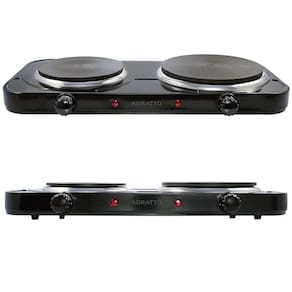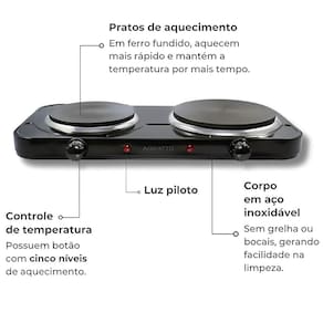 Fogareiro elétrico portátil com 2 bocas, potência total de 2500W (boca média 1000W, boca grande 1500W). Possui controle de temperatura independente por prato, resistência blindada, luz piloto indicadora de funcionamento e botões liga/desliga. Funciona com eletricidade, sem necessidade de gás. Ideal para uso doméstico e camping.Tipo