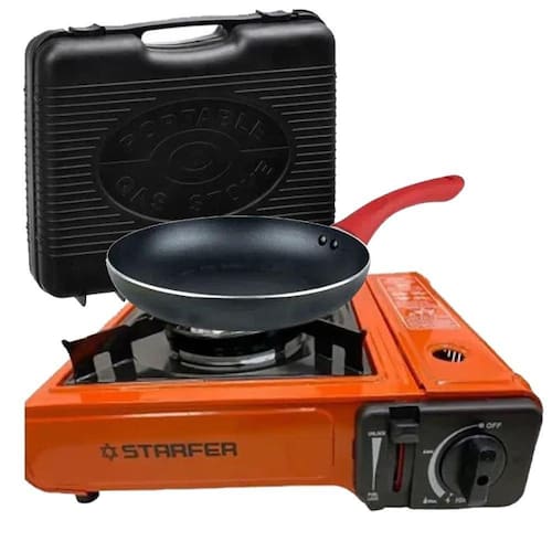 Fogão Fogareiro Portátil Com Ignição Automática 1 Boca - Starfer O fogão Starfer é ideal para você que procura rapidez e praticidade na hora de acampar e preparar suas refeições. Seu design revestido de aço inoxidável garante qualidade imprescindível. Com uma boca, acendimento automático, incluindo uma grelha móvel em aço inoxidável com protetor, chama regulável e compartimento com trava para instalação do cartucho. Indicado para viagens, acampamentos e pequenos eventos, utilizado em ambientes abertos.
