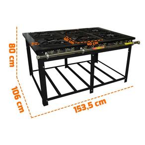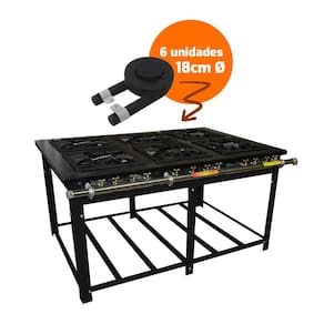 Com suas 6 bocas duplas de alta potência, você prepara diversos pratos simultaneamente, otimizando o tempo e garantindo a qualidade dos seus alimentos. A construção robusta em aço carbono e as grelhas em ferro fundido garantem resistência e durabilidade, mesmo em condições de uso intenso.