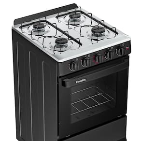 O fogão possui quatro queimadores, sendo dois deles de alta potência, ideal para o preparo rápido de alimentos, e dois de potência média, perfeitos para receitas que requerem cozimento mais lento e controlado, o acendimento é manual.