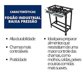 Fogão Industrial 2 Bocas Baixa Pressão P5 JCN Praticidade e durabilidade são ingredientes que tem estar em sua cozinha industrial, e é examente isso que os fogões industriais da JCN entregam. Fabricado para durar, o fogão 2 bocas baixa pressão P5 com forno da JCN possui grelhas em ferro fundido, além de contar com 1 queimadores simples e 1 queimadores duplo para reduzir o tempo de cozinhamento e atender sua demanda rapidamente! Afinal, um fogão industrial de baixa pressão é uma ótima escolha, com sua alta potência e eficiência energética, é capaz de lidar com grandes volumes de alimentos. Construído com materiais duráveis ??e de fácil limpeza, oferece controle preciso de temperatura e é perfeito para estabelecimentos movimentados que requerem desempenho confiável e eficiência. Ideal para bares, lanchonetes e restaurantes ou áreas de lazer, garantindo uma maior praticidade e qualidade no cozimento de grande quantidade de alimento. Conheça melhor o Fogão Industrial 2 Bocas Baixa Pressão P5 JCN Especificações Técnicas Material da Estrutura: Chapa de Aço Carbono Material do Registro Regulador de Gás: Zincado Material do Queimador: Ferro Fundido à alta temperatura Material dos Pés: Aço Carbono Desmontáveis e Sapatilhas de Borracha Antiderrapante Grelha: 30x30cm em Aço Carbono Mesa: Perfil 5 (50mm) Pintura: Preto Texturizado Funcionamento: À Gás Acendimento: Manual Pressão do Gás: Baixa Pressão Queimadores: 1 Queimador Simples e 1 Queimador Duplo Consumo: 300gr/hr por queimador queimador simples e 600gr/hr por queimador duplo Medidas do Produto Montado Altura: 82cm Largura: 74cm Profundidade: 49cm Peso: 16kg Garantia 3 meses contra defeito de fabricação