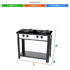 - Queimadores de alto rendimento, em ferro fundido, possuindo potência de 4.090kcal no modelo chama tripla frontal e 3.659kcal no modelo chama dupla;
