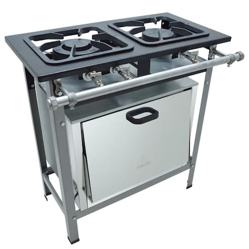 Gambiarra 1" cromada. Registros tipo borboleta. Grelhas com cantos arredondados. Queimadores palmatória 300gr/h. Queimadores duplos de 600gr/h, ferro fundido. Estrutura reforçada em aço inox Aisi 430*. * Aço com baixo teor de carbono, portanto boa resistência à corrosão.