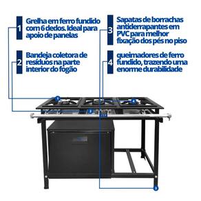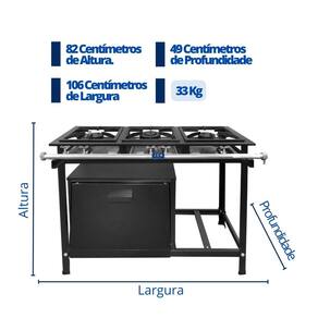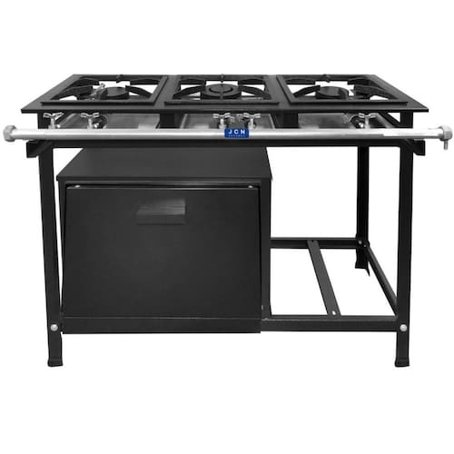 Fogão Industrial 3 Bocas Baixa Pressão P5 com Forno JCN Praticidade e durabilidade são ingredientes que tem estar em sua cozinha industrial, e é examente isso que os fogões industriais da JCN entregam. Fabricado para durar, o fogão 3 Bocas baixa pressão P5 com forno da JCN possui grelhas em ferro fundido, além de contar com 2 queimadores duplos e 1 queimador simples para reduzir o tempo de cozinhamento e atender sua demanda rapidamente! Afinal, um fogão industrial de baixa pressão é uma ótima escolha, com sua alta potência e eficiência energética, é capaz de lidar com grandes volumes de alimentos. Construído com materiais duráveis ??e de fácil limpeza, oferece controle preciso de temperatura e é perfeito para estabelecimentos movimentados que requerem desempenho confiável e eficiência. Ideal para bares, lanchonetes e restaurantes ou áreas de lazer, garantindo uma maior praticidade e qualidade no cozimento de grande quantidade de alimento. O forno pode ser utilizado para o preparo de diversos assados, assim como: bolos, pães e salgados. A temperatura é mais uniformemente distribuída devido ao isolamento térmico em lã de vidro entre as paredes duplas do forno. Conheça melhor o Fogão Industrial 3 Bocas Baixa Pressão P5 com Forno JCN Especificações Técnicas Material da Estrutura: Chapa de Aço Carbono Material do Registro Regulador de Gás: Zincado Material do Queimador: Ferro Fundido à alta temperatura Material dos Pés: Aço Carbono Desmontáveis e Sapatilhas de Borracha Antiderrapante Grelha: 30x30cm contendo 6 dedos em Ferro Fundido Mesa: Perfil 5 Pintura: Preto Texturizado Funcionamento: À Gás Acendimento: Manual Pressão do Gás: Baixa Pressão Queimadores: 2 Queimadores Duplo e 1 Queimador Simples Consumo: 600gr/hr por queimador queimador duplo e 300gr/hr por queimador simples Medidas Internas do Forno Altura: 31cm Largura: 48cm Profundidade: 34cm Capacidade: 49L Medidas Externas do Forno Altura: 49cm Largura: 59cm Profundidade: 48cm Peso: 14kg Medidas do Produto Montado Altura: 82cm Largura: 106cm Comprimento: 49cm Peso: 33kg Garantia 03 meses pelo Fornecedor